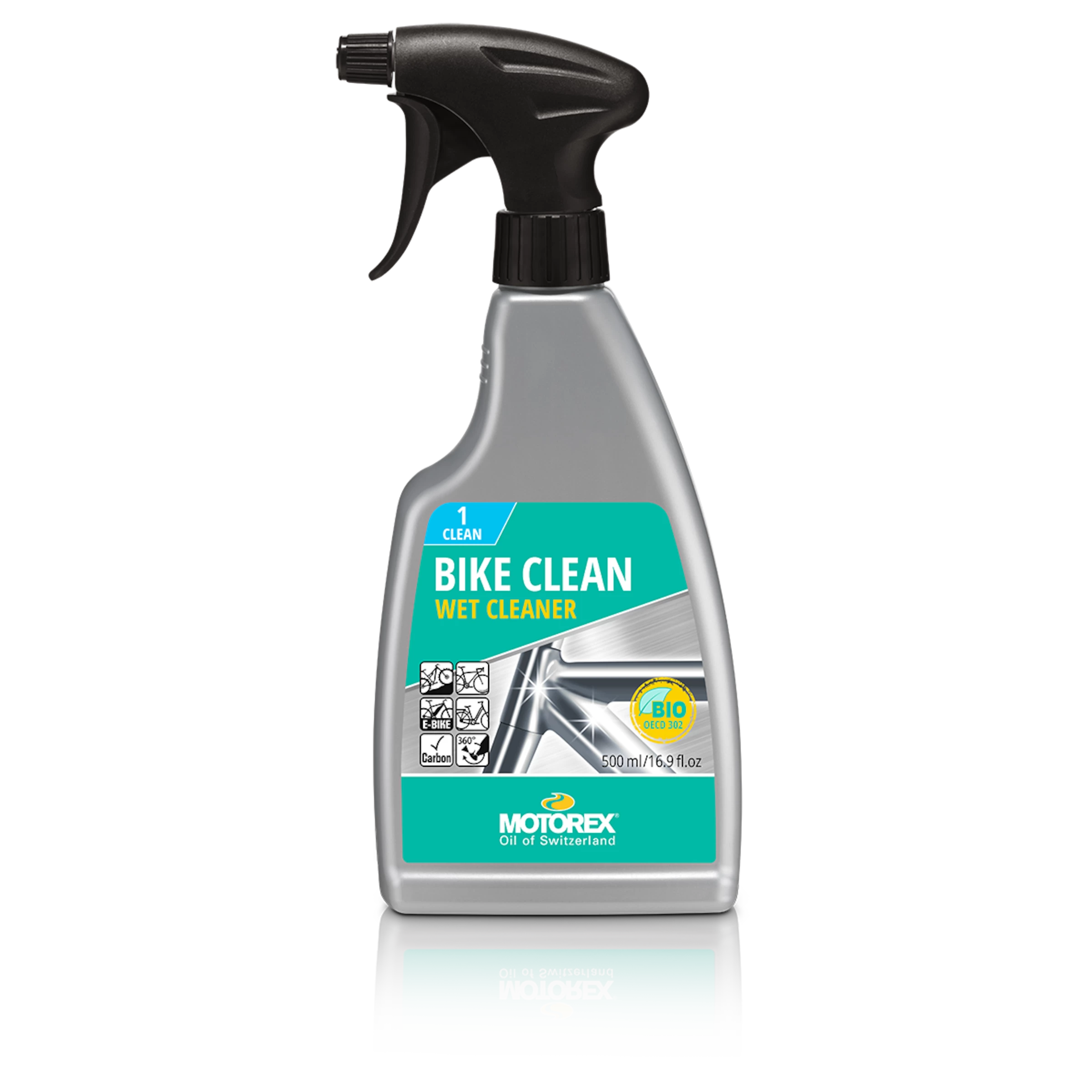 Emploi: enlever sommairement la terre agglomérée, vaporiser Motorex Bike Clean, laisser agir et rincer à l’eau ou frotter minutieusement avec une éponge (p. ex. l’éponge d’entretien Motorex, art. 339315). Ceux qui visent à une protection parfaite après nettoyage, nous conseillons de traiter le vélo avec Motorex Bike Grease 2000 (art. 492086) et Motorex Bike Shine (art. 492089) ensuite.