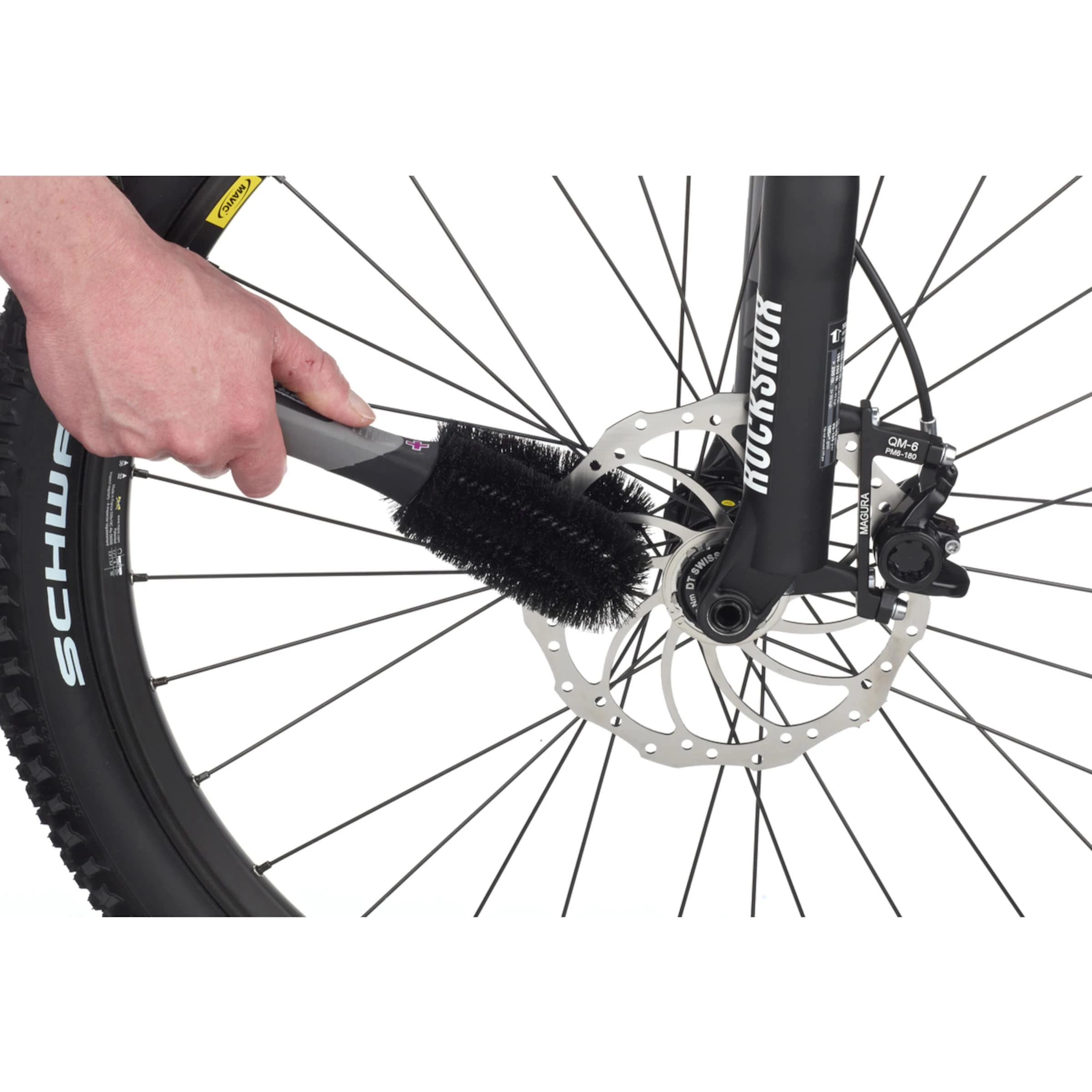 Avec la 2 Prong Brush en deux parties, vous nettoyez les rayons, disques de frein, fourches, pédaliers ou pédales. La séparation au milieu fait sauter une phase du nettoyage car les manivelles p. ex. sont nettoyées automatiquement de l’intérieur et de l’extérieur.