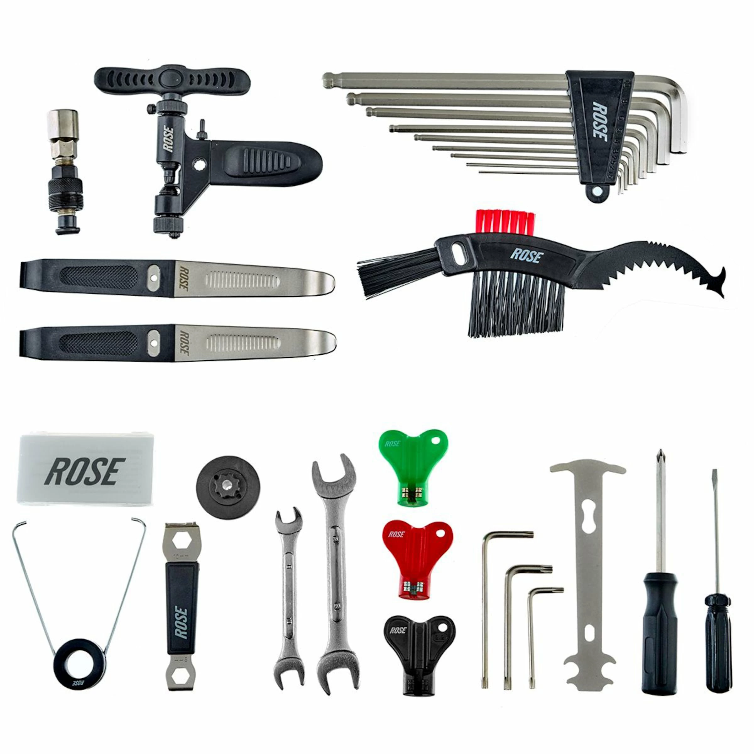 Les bikeurs ambitieux et bricoleurs amateurs en possession de la boîte à outils ROSE ALL2GETHER Performance XL sont préparés pour tout, ou presque. Un choix soigneux des outils de qualité qui conviennent pour des réparations et tâches d’entretien importantes sur des vélos de route, vélos tous terrains et vélos de cyclotourisme modernes, ne laisse quasiment rien à désirer. Adaptée aux montages et mesures courants à nos jours, la boîte de réparation dispose d’une large gamme d’outils spéciaux pour la plupart des tâches sur votre vélo.