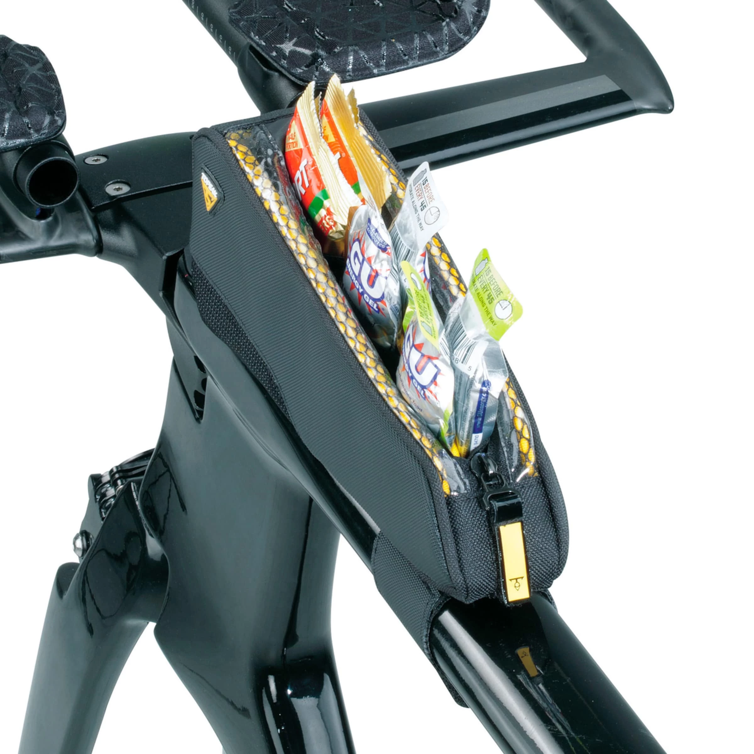 La sacoche TOPEAK FASTFUEL TRIBAG LARGE à attacher au tube supérieur est parfaite pour les vélos de triathlon pourvus de fixations de porte-bidon au tube supérieur. La couverture transparente facilite l’accès au contenu, soit smartphone, espèces, barres énergétiques et outillage.