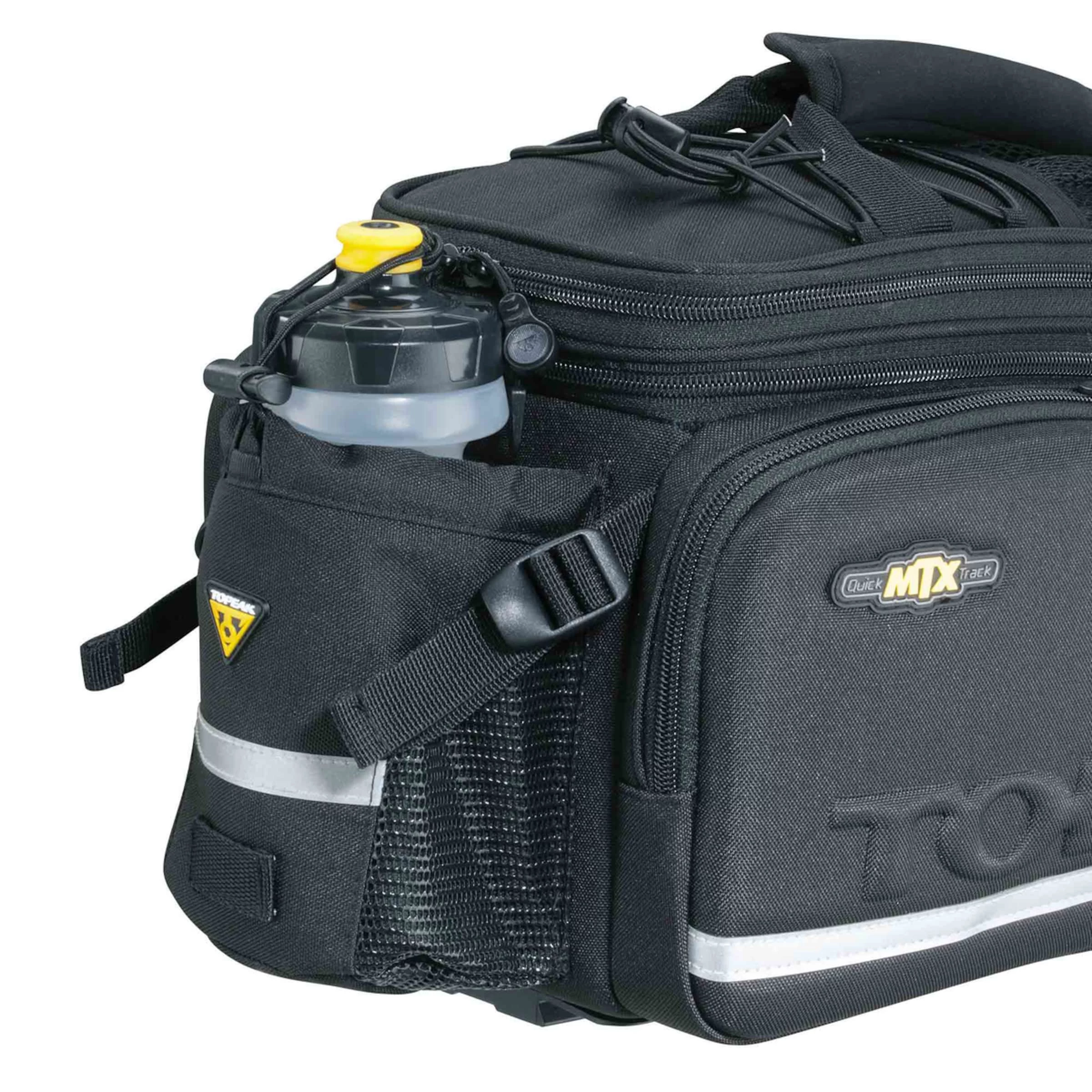 Note: avant de rabattre les poches latérales, il faut mettre en place un porte-bagages avec des supports sur les côtés. Pour le Topeak MTX Beam Rack, il vous faut aussi les MTX dual Side Frames (art. 586132).