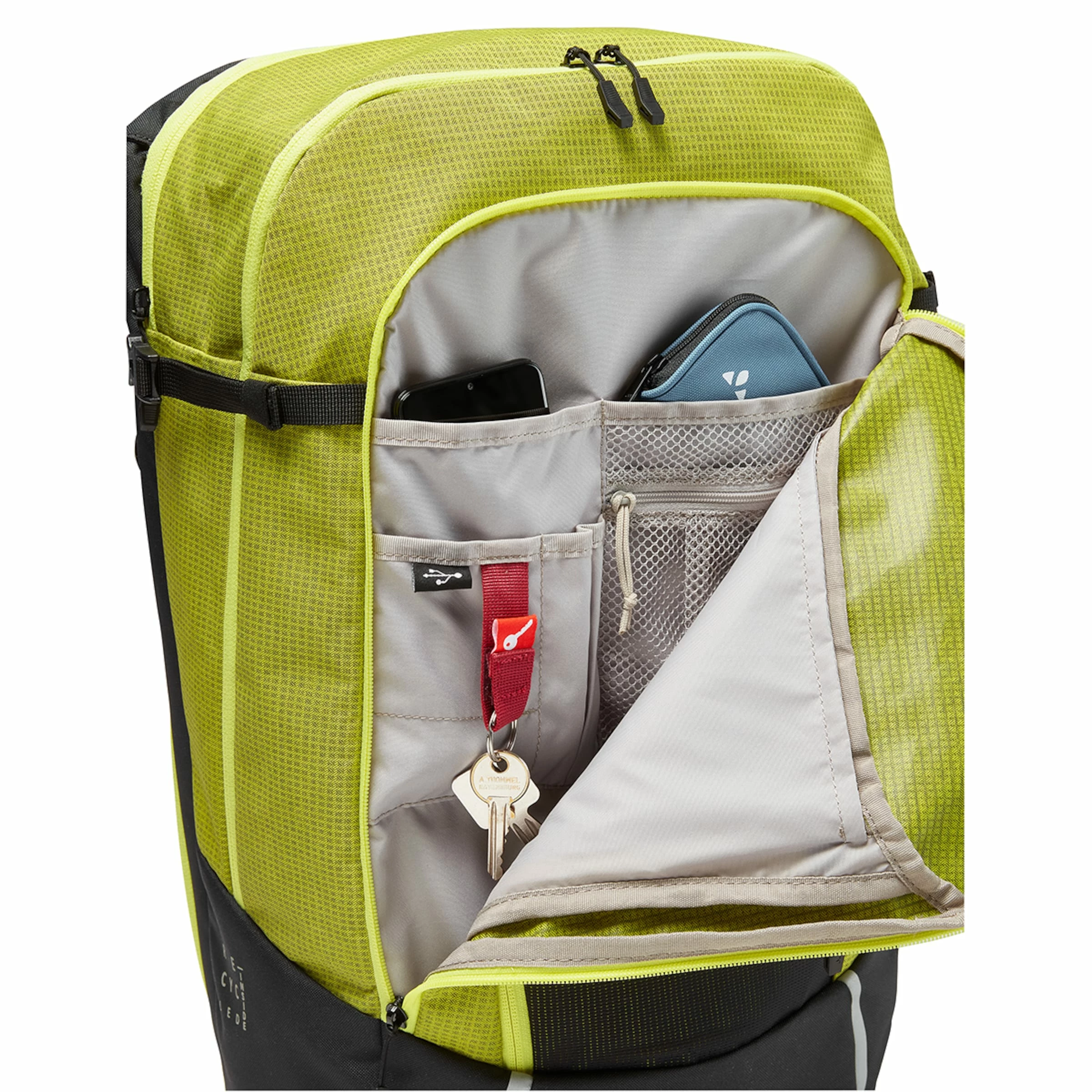 La sacoche de vélo 2 en 1 est fabriquée de manière climatiquement neutre. Elle est multifonctionnelle, car elle offre des éléments réfléchissants, un clip à clés, une fixation pour clignotant et une housse de pluie qui protège vos ustensiles de travail contre le mauvais temps!